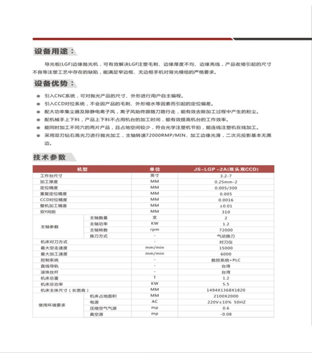 簡(jiǎn)介—— 導(dǎo)光板拋光機(jī)設(shè)備用途導(dǎo)光板(LGF)邊緣拋光機(jī),可有效解決LGF注塑毛刺、邊緣厚度不均、邊緣亮線(xiàn),產(chǎn)品收縮引起的尺寸不良