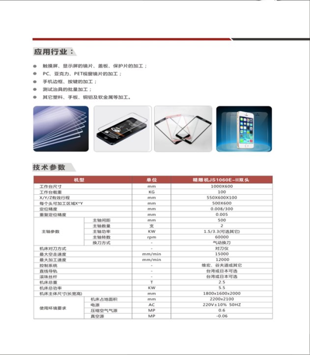 簡介—— 雙頭精雕機應(yīng)用行業(yè):1.觸摸屏、顯示屏的鏡片、蓋板、保護片的加工;2.PC、亞克力、PET視窗鏡片的加工;3.手機邊框、